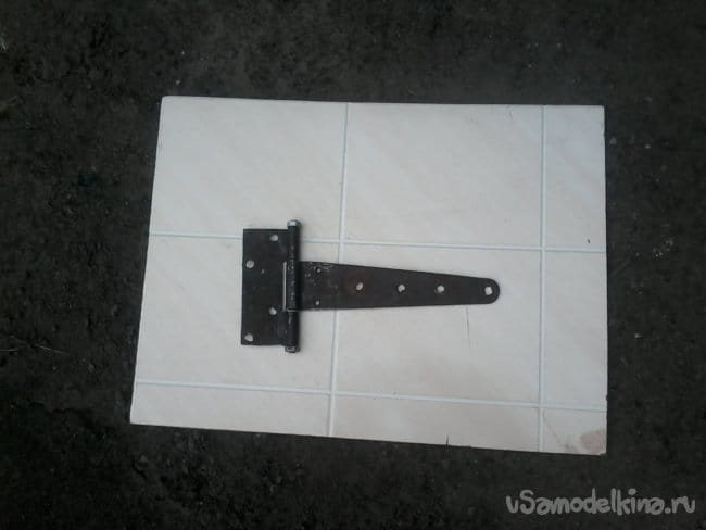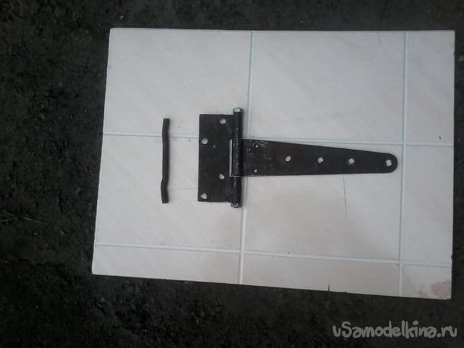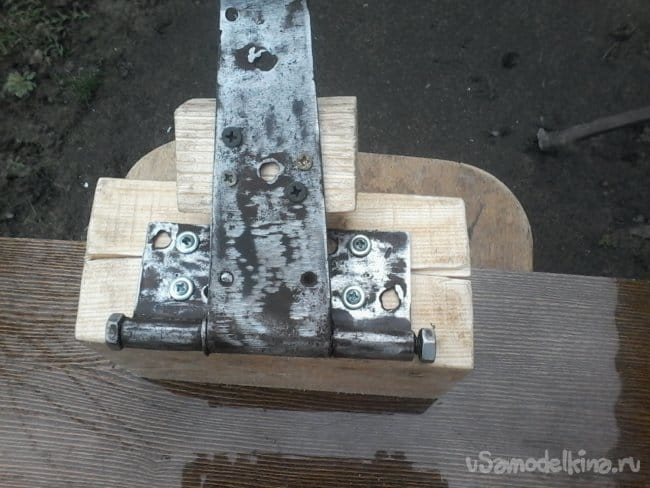 Материалы: Небольшой клочок полированной ДСП, деревянный брусок размером 100*150*500 мм, брусок 20*20*300 мм, саморезы разной длинны – 16 мм, 55 мм, 70 мм, винт М 8 – 1шт, болт М 5 –длинной 10 см – 1шт, гайки М 5 и шайбы – несколько штук, гвозди -100 мм – 5шт, резиновые небольшие ножки от Б/У аппаратуры – 4 шт, небольшой клочок оцинкованной стали толщиной 1 мм, большая дверная петля – 1шт, шпилька М 8 длинной, чуть больше высоты основания петли – 1шт, и две гайки М 8, пружина диаметром 10 мм, длинной -250 мм.