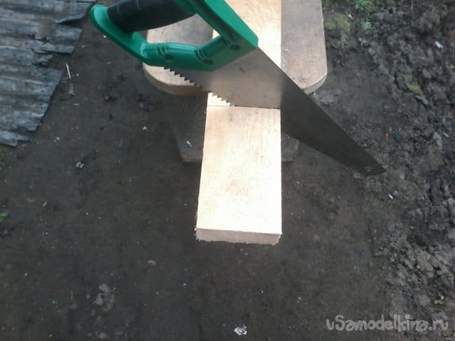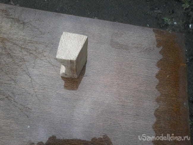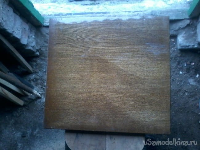 Шаг-1. Ножовкой по дереву вырезаем квадрат 400*400 мм полированной ДСП, деревянный брусок – размером 200*150*100 мм, и брусок 300*20*20 мм.