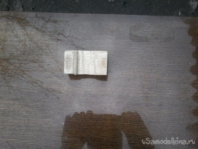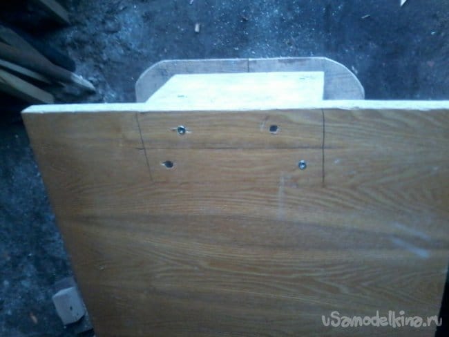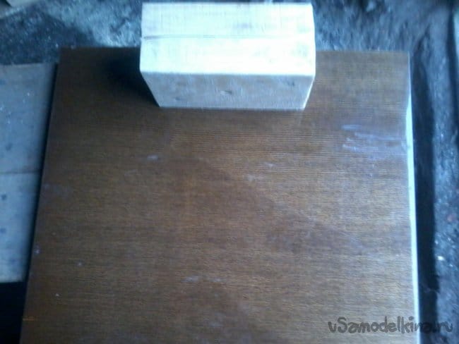 Шаг-2. К квадрату ДСП прикручиваем саморезами большой брусок, как показано на фото.