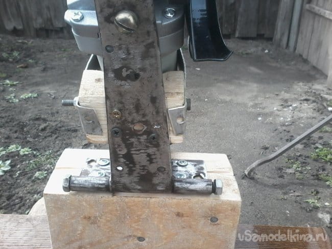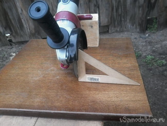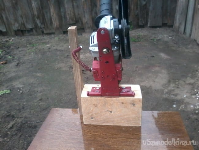 При сборке конструкции проверяем угол установки отрезного круга. Если он не соответствует 90 –та градусам, то его можно подрегулировать изгибом конца петли в ту, или иную сторону.