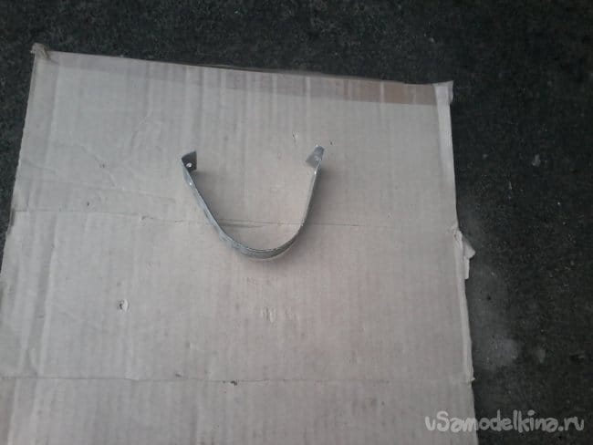 Шаг-5. Сбоку, по центру этого бруска сверлим сквозное отверстие диаметром 5 мм. Из оцинкованной стали отрезаем полоску шириной 20 мм, и делаем хомут.