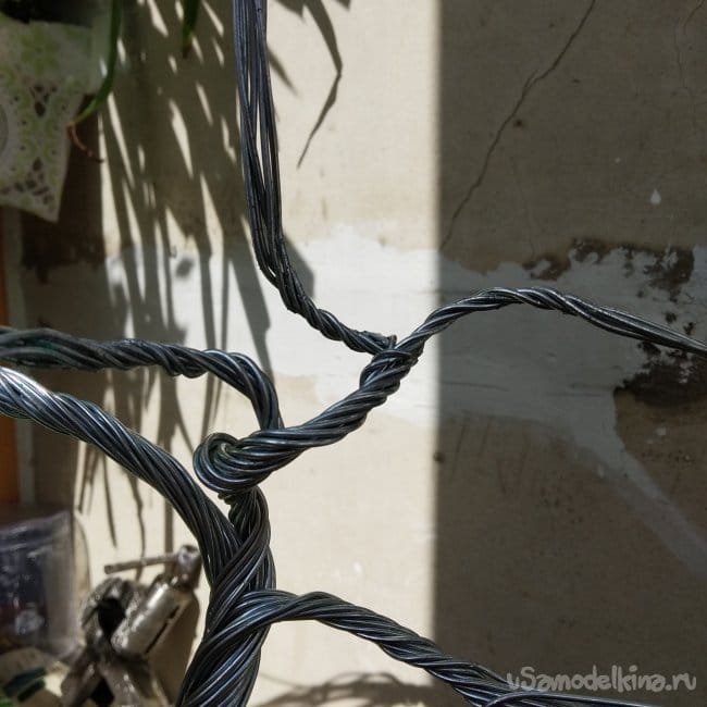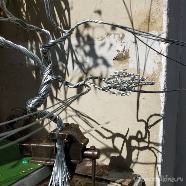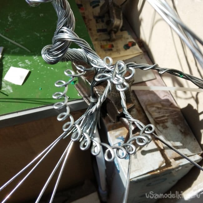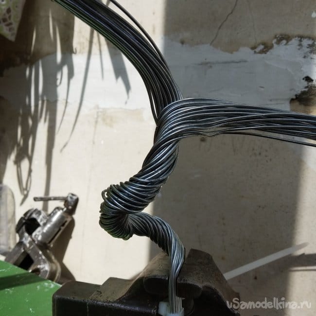 Далее разделяем трос на две части, перед этим закрутив его в какую-нибудь завитушку.