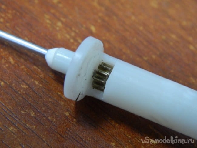 Внутренний диаметр трубки иглы составляет 1,5 мм, в который свободно входит ось малой шестерёнки ø1,3 мм. Для того, чтобы шестерня находилась у начала трубки необходимо рассверлить пластмассовый корпус иглы до ø6 мм.