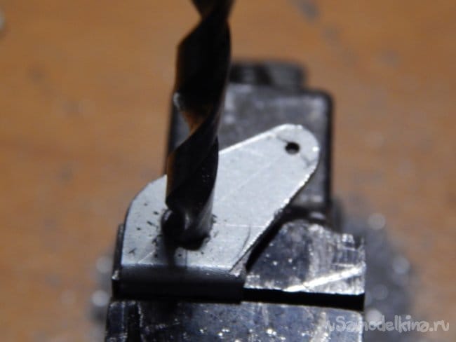 Теперь настало время соединить корпуса иглы и мультипликатора. Сверлом ø4,5 мм рассверливаем отверстие оси малой шестерни в нижнем (условно) уголке корпуса.