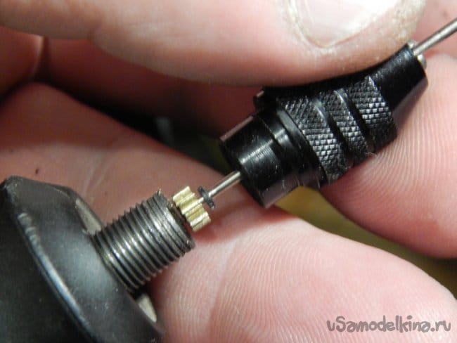 Для установки свёрл я решил использовать принцип крепления медицинских игл к шприцу, или использование конуса Морзе. Я не зря так подробно описал в начале статьи доработку свёрл для ручной «сверлилки» с использованием пишущих узлов шариковых ручек. Эти пишущие узлы по определению являются трубками с начальным внутренним диаметром 1 мм, и если для «сверлилки» это не имеет значения (там зажим происходит по внешнему диаметру), то для новой конструкции подходит очень хорошо. Для этого выходной конец вала малой шестерёнки стачиваем на конус до диаметра 0,9-0,8 мм. Я это сделал закрепив вал в патрончик, установленный в бормашинке