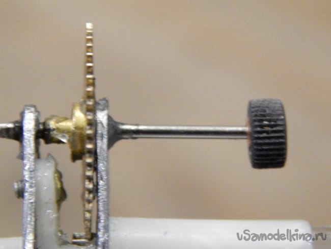 Просто большую шестерню провернуть больше чем на половину оборота при всём желании не получается. Поэтому было решено немного доработать привод. Удлиннив ось большой шестерни я напрессовал на него колёсико от кремневой зажигалки. Чтобы их соединить, пришлось в колёсико, имеющее внутренний диаметр 2,5 мм впрессовать медную трубку (от манометрического термометра) имеющую такой же внешний диаметр,и рассверлив внутренний до 1,3 мм.