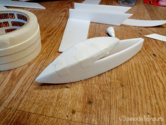 Для ускорения сборки, всегда подсушиваю клей минут 5. После соединяю и получается достаточно крепко. Ну как крепко? Можно продолжать сбору дальше не опасаясь, рассоединения конструкции. Шов стягиваю полоской малярного скотча. Причем стягиваю, видно на фото. Для компенсации приклеиваю скотч с обратной стороны.