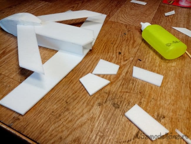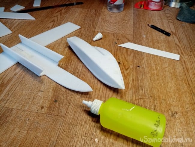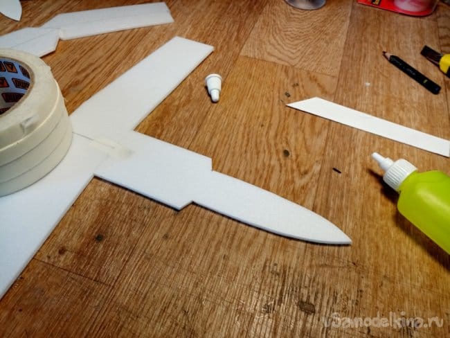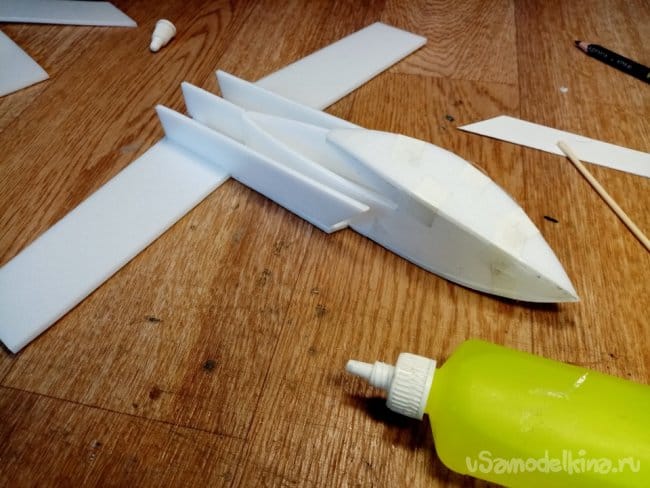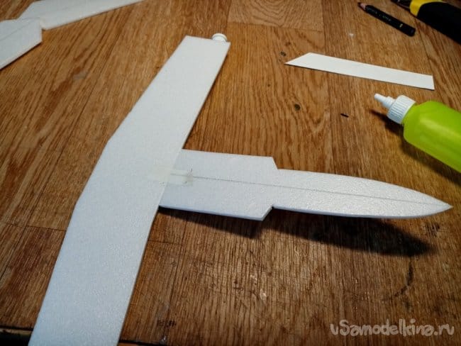Приклеиваю вертикальные стойки соединения крыльев и кили на кончиках фюзеляжа.