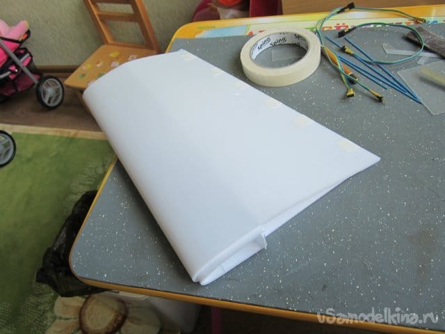 Пробный кессон крыла планера изготовил дома. Поскольку подложка под ламинат достаточно хорошо гнется, фен не использовал. Согнулась заготовка без проблем.