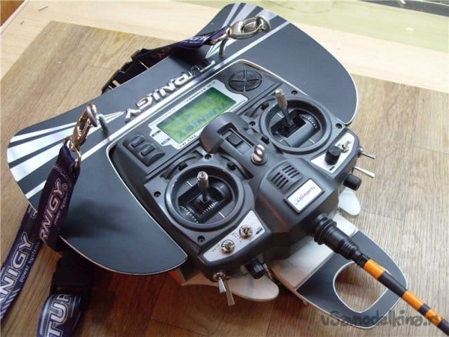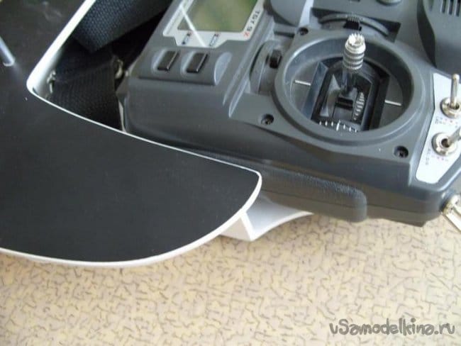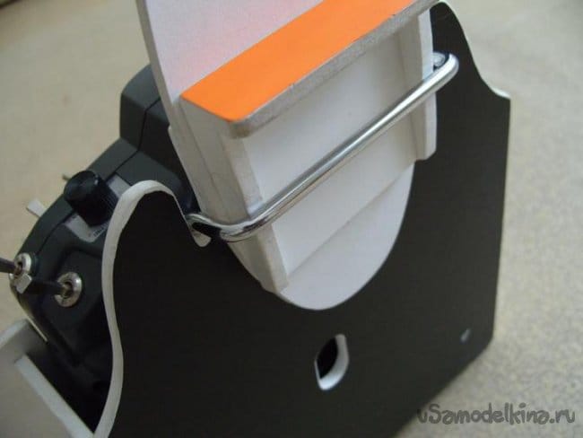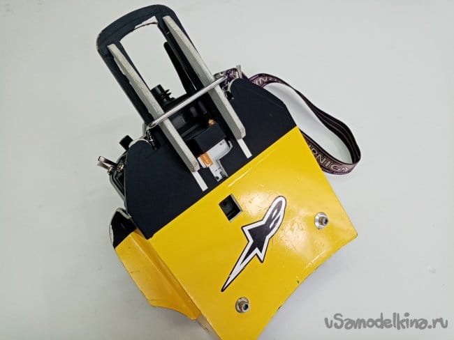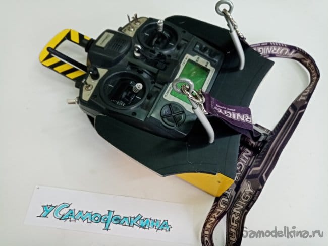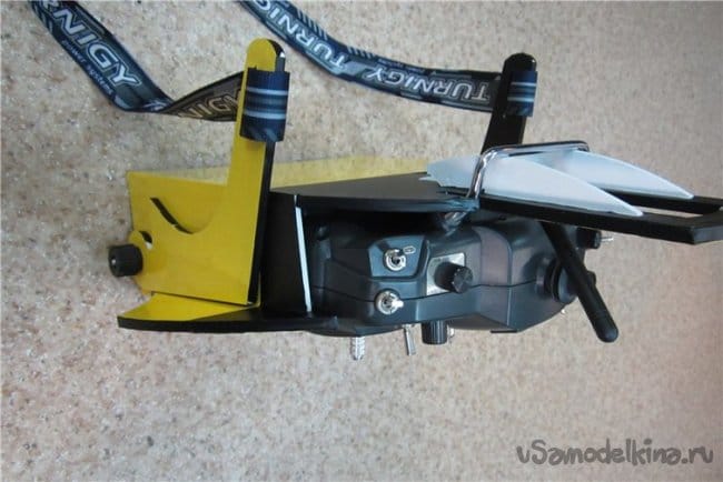 Держать пульт четырьмя оставшимся пальцами неудобно. Решил сделать полеты более комфортными. Одеваю столик на шею, руки кладу удобно на боковые площадки. Как в ресторане расположился и взлетел.