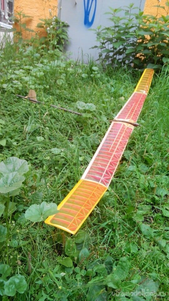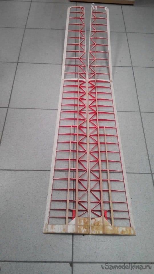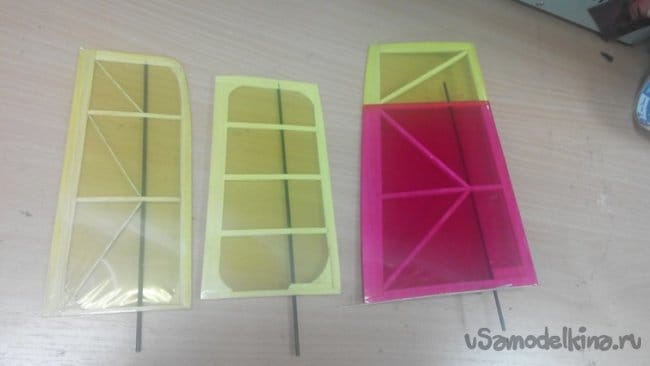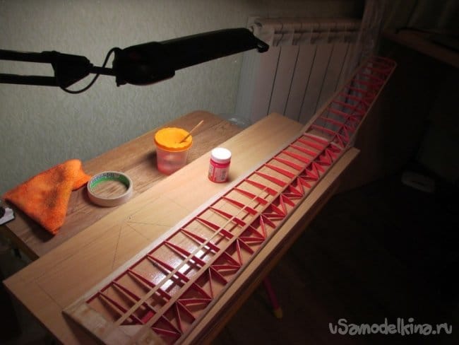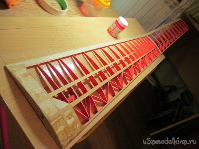 Не захотелось закрывать ажурную структуру глухой пленкой, буду обтягивать прозрачной. Для хорошей видимости окрасил внутренние плоскости нервюр флуоресцентным акрилом.