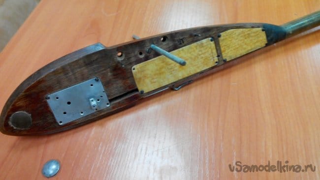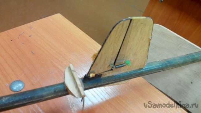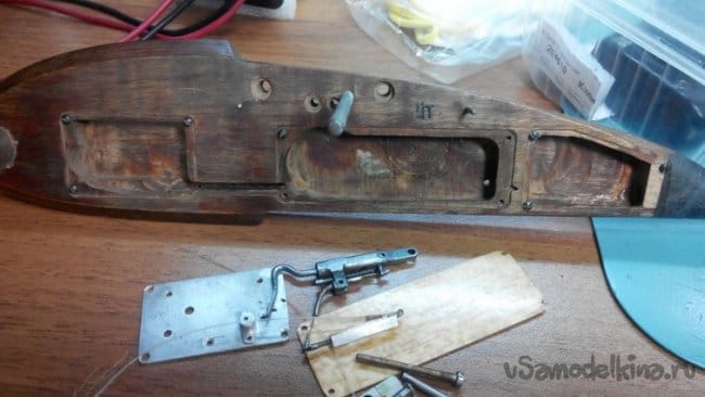На рудере закреплены кабанчики для тяги и пружины компенсатора.