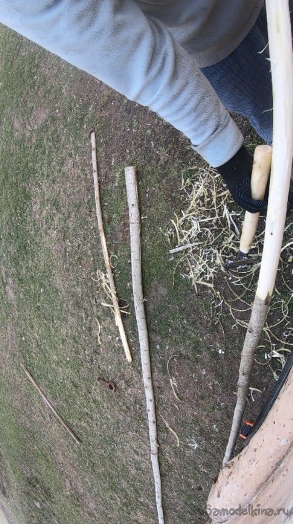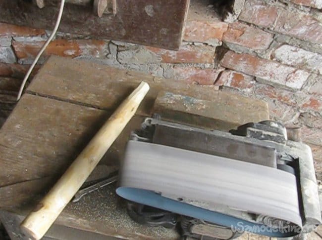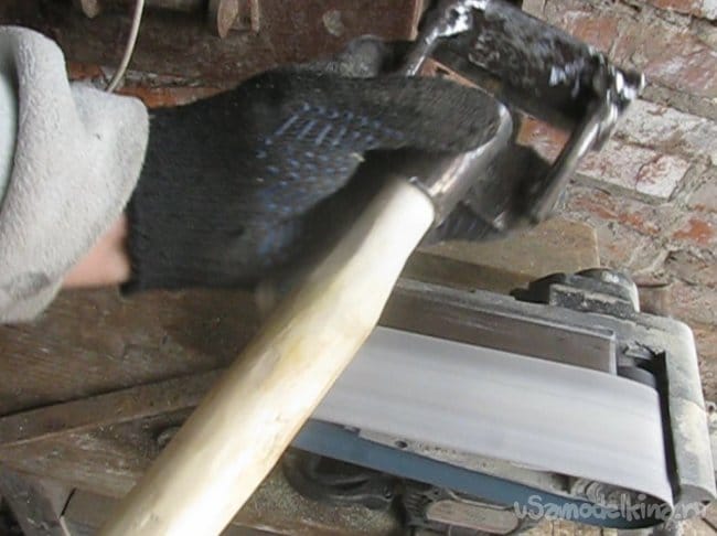 Черенок сделал из сухого клена, подточил ножом и подшлифовал на ЛШМ, в результате чего забил в трубку и прикрутил саморезами. Быть может, есть смысл сделать рукоять кольцом, чтобы можно было удобно и надежно взять ручку в кулак.