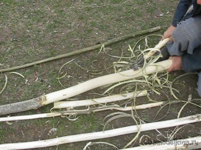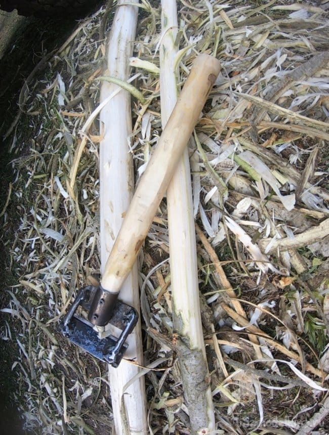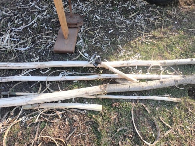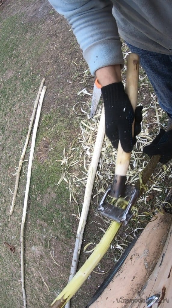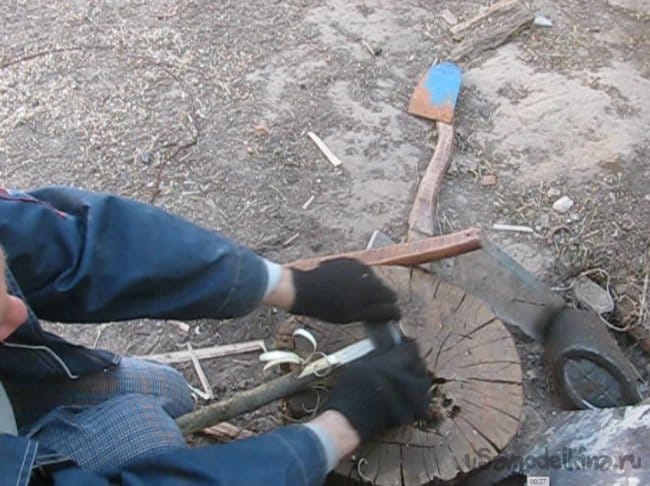 Главное достоинство – высокая скорость снятия коры, также легче срезаются сучки, если сравнивать с ножом. Работать можно одной рукой, второй рукой держим палку и вращаем. Если бревно попалось жирное, кидаем на землю и спокойно снимаем кору, ну или на что-то опираем под удобным углом.