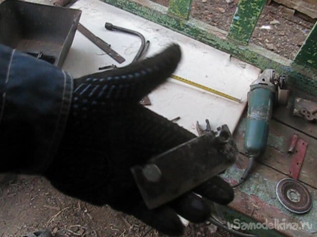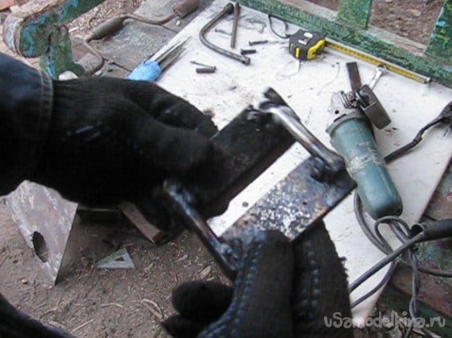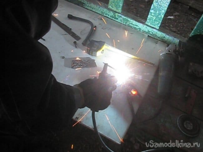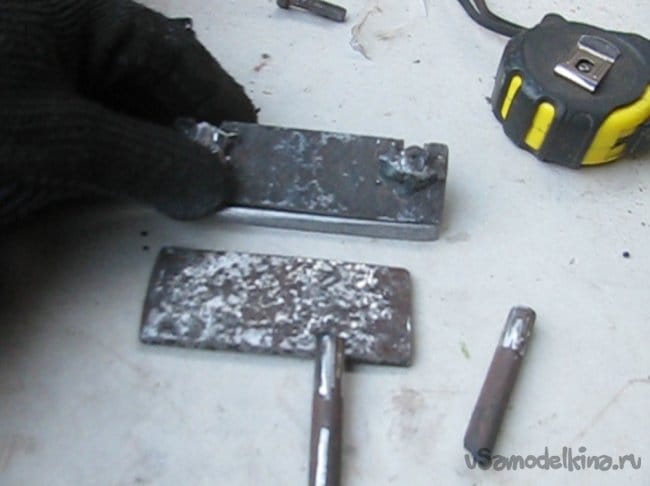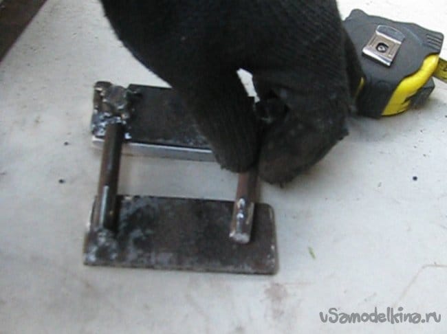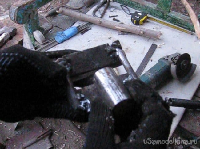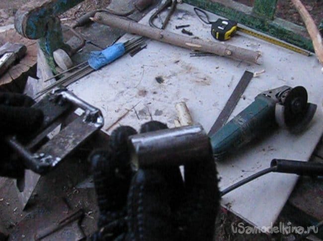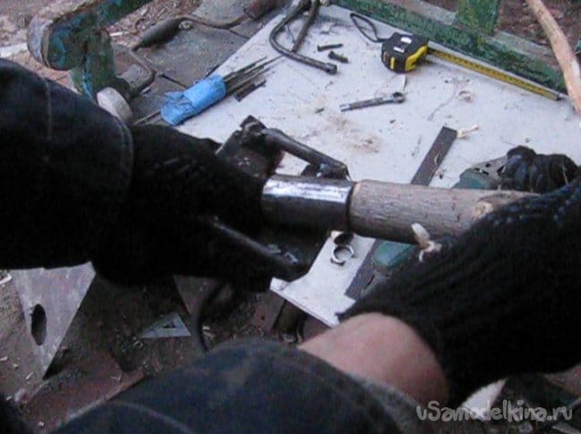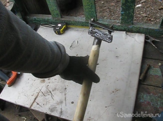 К ограничительной пластине привариваем кусок трубы, в моем случае это часть ножки старой советской кровати. В трубке сверлим отверстия под гвозди или саморезы. Трубу привариваем под некоторым углом, чтобы при работе рукой не цепляться за палку, делал на глаз.