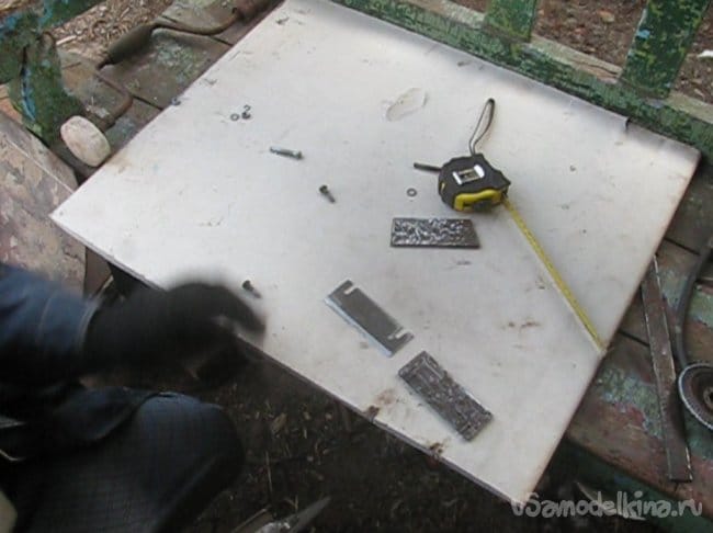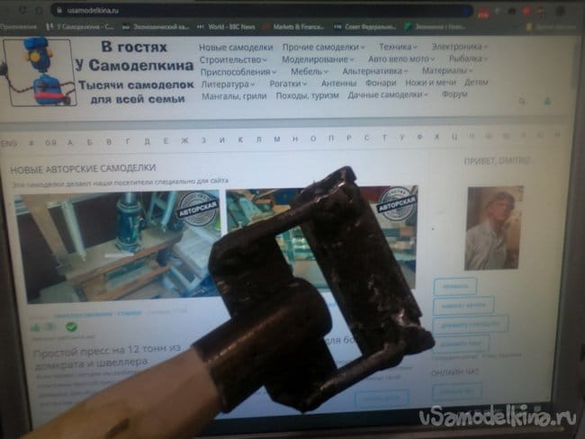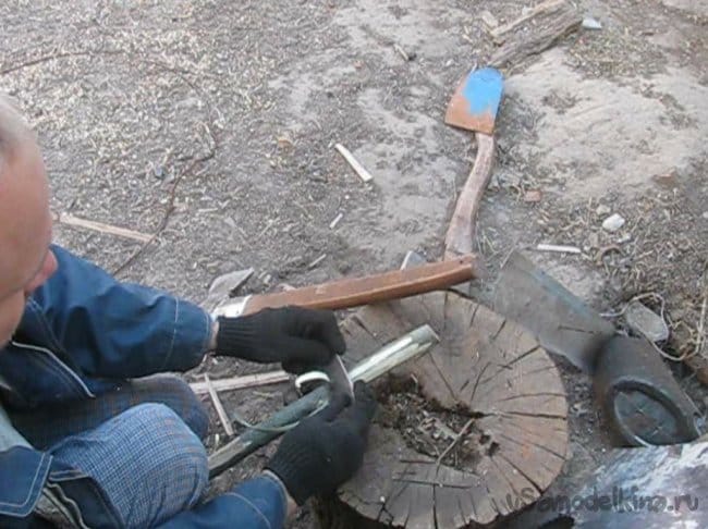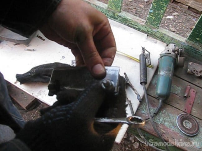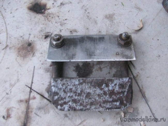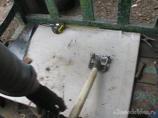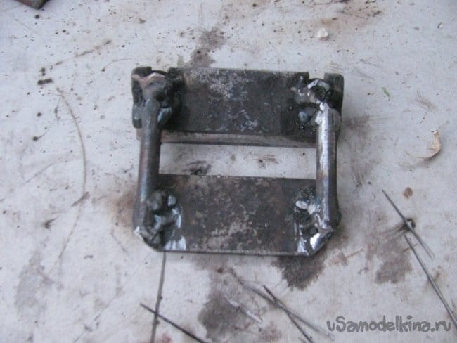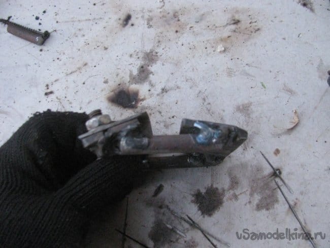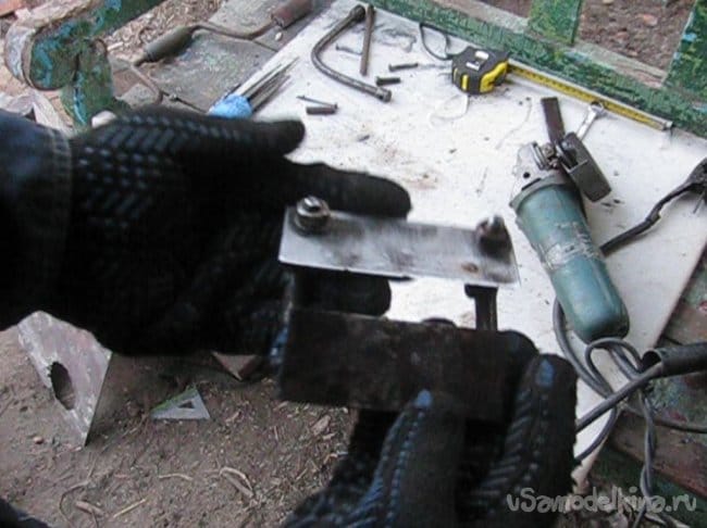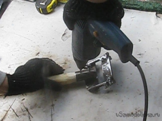 К ограничительной пластине привариваем кусок трубы, в моем случае это часть ножки старой советской кровати. В трубке сверлим отверстия под гвозди или саморезы. Трубу привариваем под некоторым углом, чтобы при работе рукой не цепляться за палку, делал на глаз.