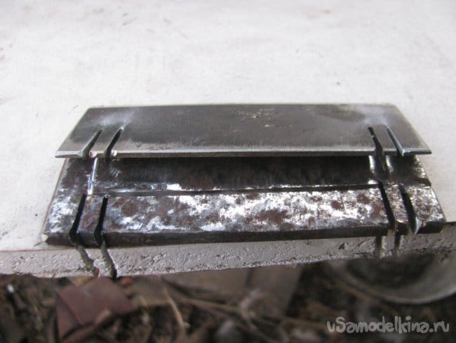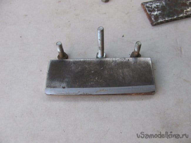 Из стальной пластины 5 мм толщиной сделал держатель для резца, делаем пропилы в держателе и резце и выбираем металл, получились вот такие пазы под болты. В завершении приварил головки болтов, теперь резец стягивается ключиком на 14 двумя гайками с шайбами, держится крепко.