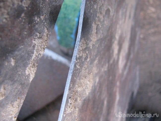 Делаем своего рода упор, как на бритве или рубанке, свариваем детали через стальные стержни, выставив зазор, через который будет отходить стружка. Угол выбирал на глаз, по опыту того, как я снимал кору вручную резцом. Наверное, угол там в районе 25-30 градусов, но может я ошибаюсь.