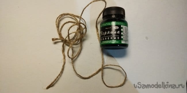 В общем, берём зелёные чернила и джутовую верёвку, заранее отмеренную на данную веточку, и соединяем эти два предмета. Потом промываем верёвку, пока она не перестанет отдавать цвет.