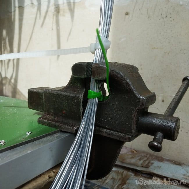 Опять стягиваем моток двумя стяжками, разрезаем кусачками и закрепляем в тисках.