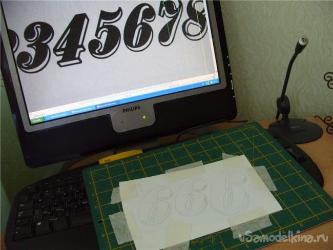 Нахожу понравившуюся циферку в книге по шрифтам. Масштабирование происходит так. Фотографирую, гружу в компьютер, вывожу на экран и карандашиком срисовываю.