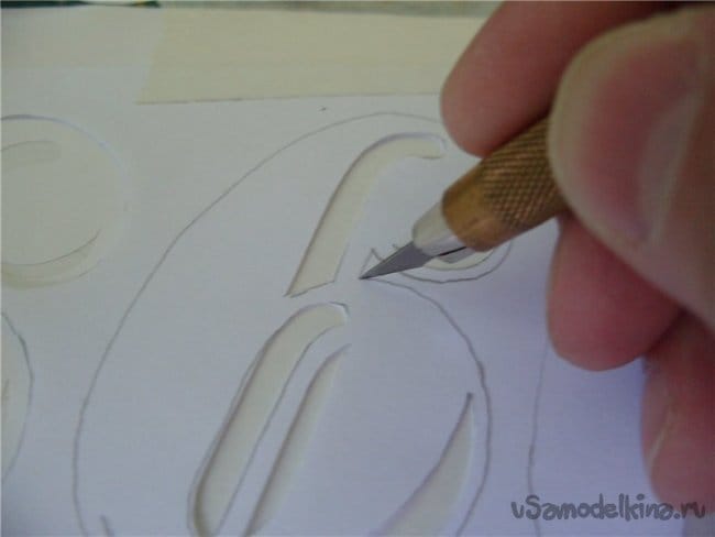 Затем закрепляю на коврике для резьбы бутерброд из пленки и рисунка. Чтобы при вырезании ничего не смещалось. Режу бутерброд маленьким треугольным ножиком.