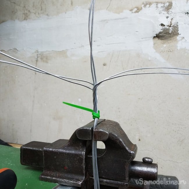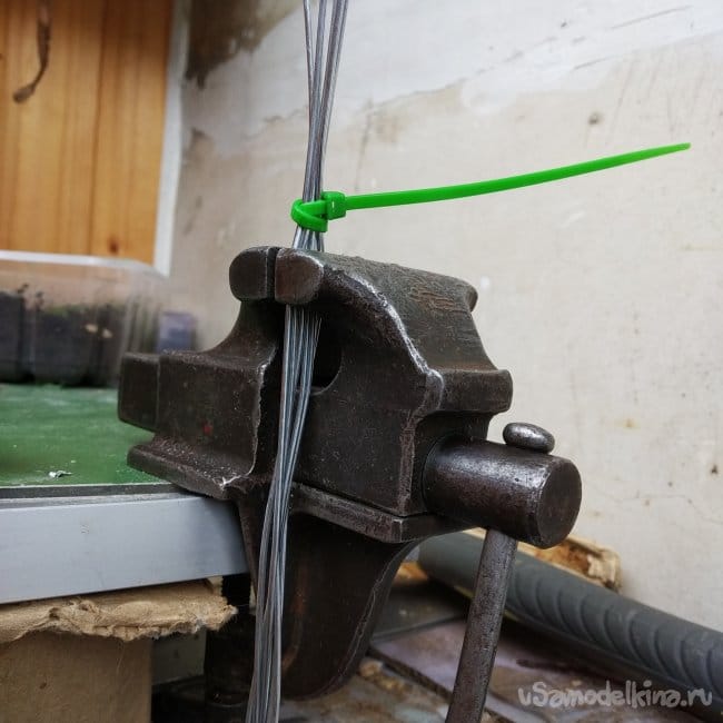 Далее раскусываем его кусачками, фиксируем корневую часть стяжкой и покрепче зажимаем в тисках.