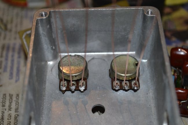 Обратите внимание на гнёзда джеков. В моем случае конструкция гнезда устроена так, что корпус заземляется при установке самих гнезд. Если Вы будете использовать пластиковые гнезда, но заземлить корпус нужно например через корпус потенциометра, подпаяв к нему минус. Необходимо это для экранировки всей схемы от внешних наводок.