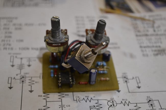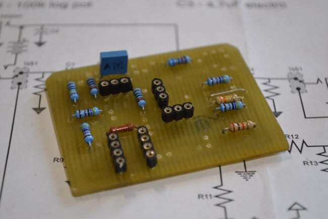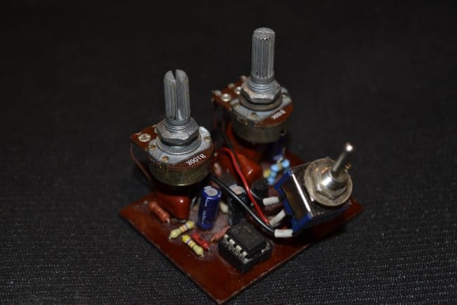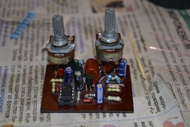 TL072 думаю автором был выбран в силу его большой распространенности. Как всегда я советую использовать вместо него NE5532 или JRC4558. Эти операционные усилители имеют ту же цоколевку, что и TL072, но звучат намного чище. Что в этой педали особо актуально, так как гитарный сигнал не искажается, а лишь регулируется его громкость. По факту используется только один операционный усилитель из двух, находящихся в этой микросхеме, так что если решите повторить на своей плате — можете использовать любой чисто звучащий ОУ. Транзисторы 2N5088 можно заменить на любые аналогичные, в моём случае были использованы ширпотребные BC547. Некоторые номиналы в схеме довольно редковстречающиеся, к примеру резисторы на 200К и 2М, их я заменил просто последовательно соединенными резисторами на 100К и 1М.