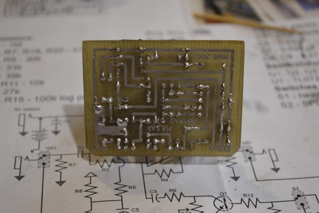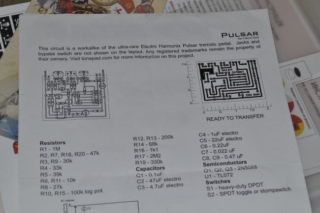 Схема была выбрана очень простая. Хотя...нет, давайте я буду честен с Вами, а Вы со мной. Схему я не выбирал. Сейчас карантин и жуть как чешутся руки что-то сделать. Порывшись в запасах старых платок, схем и деталюх я нашел платку от Tonepad Pulsar и корпус. Было решено оформить всё это в готовое изделие. Платку я, в итоге, переделал, но об этом позже.