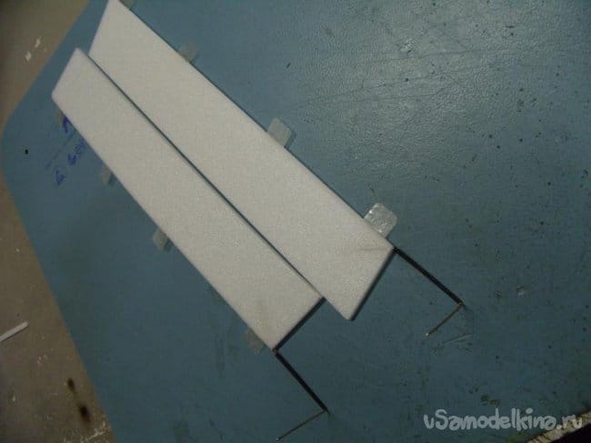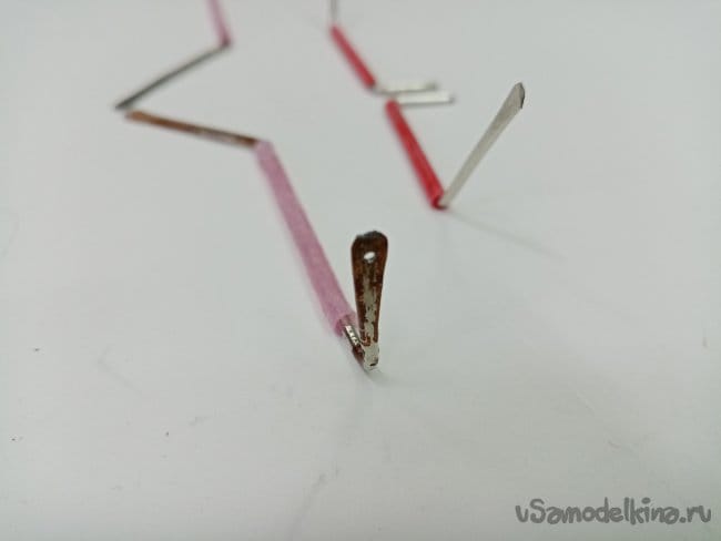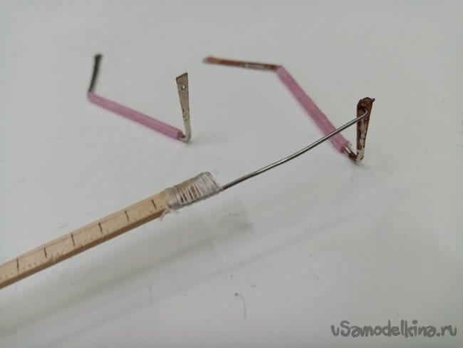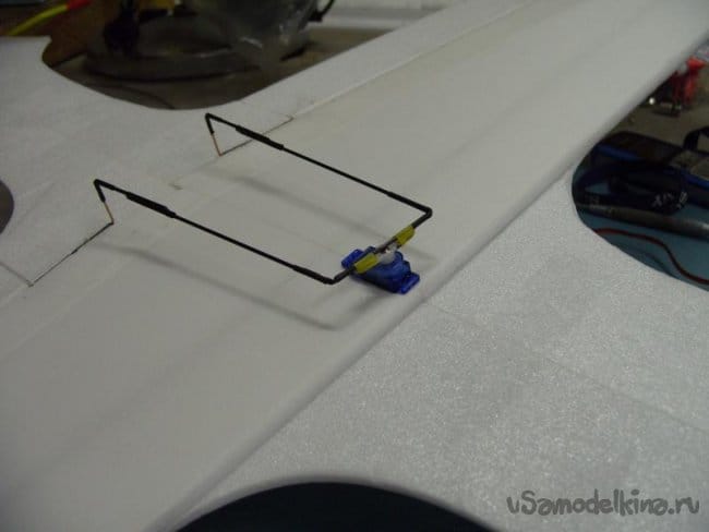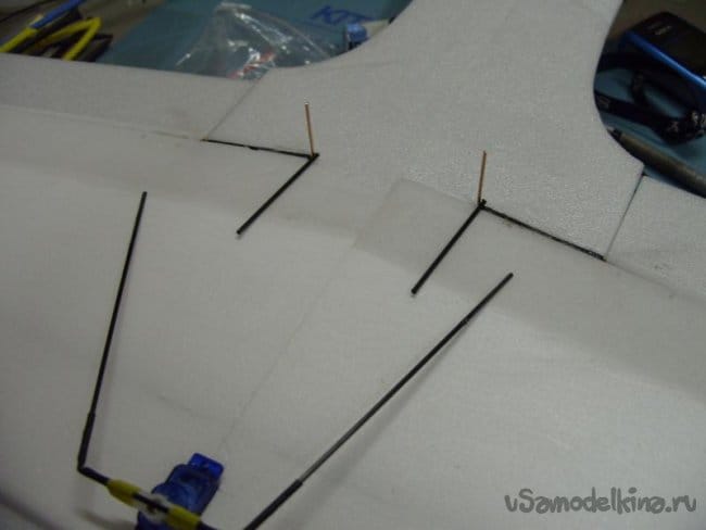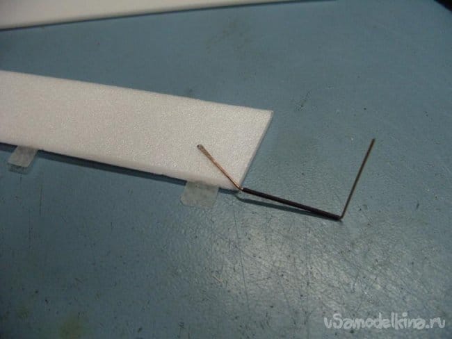 Для передачи усилия изготовляю торсионы. Из проволоки, или как на фото толстых канцелярских скрепок.Один конец расплющиваю и на клею втыкаю в элерон. Второй конец соединяю с тягой идущей от качалки сервопривода при помощи такой-же проволоки.