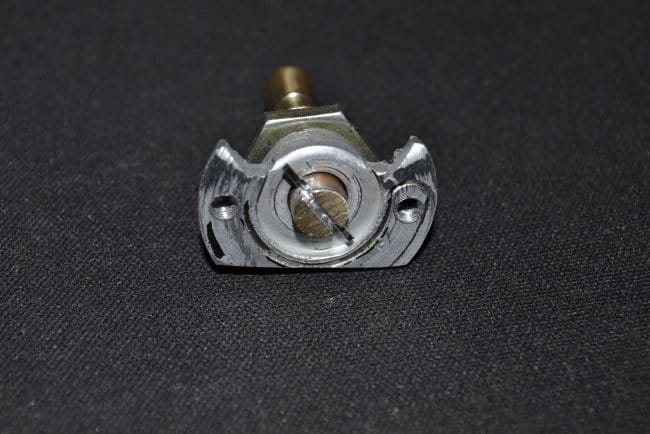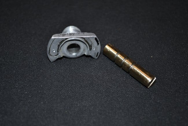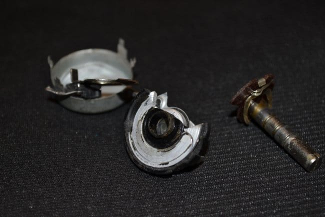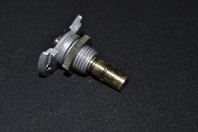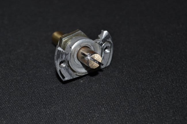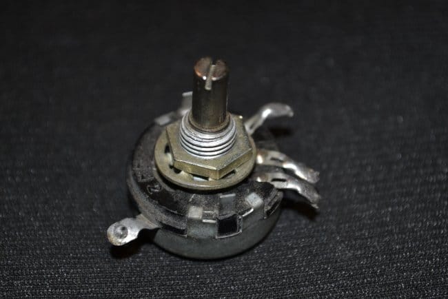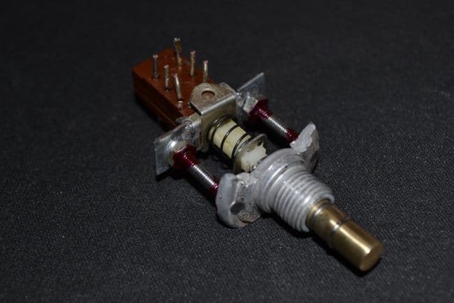 Вообще в чем смысл этой кнопки? Основной её параметр — это вандалоустойчивость, кнопка должна выдерживать конвульсирующие биения кедом в процессе наслаждения от запила какого-то крутого рифа. Поэтому нужно изготовить "силовую" часть с ограничением хода, которая уже будет нажимать сам переключатель. Первым делом разбираем потенциометр. Я взял поврежденный потенциометр, так что и восстанавливать его нет никакого смысла.