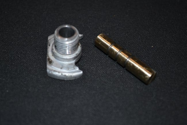 От алюминиевой детали отпиливаем лишнее. Ну или не отпиливаем) Так же сверлим в ней 2 отверстия и нарезаем резьбу. Если нет метчиков можно просто зафиксировать винт гайкой, будет немного выпирать, но ничего страшного. К валу, который теперь будет штоком, припаиваем с одной стороны обрезок скрепки, это будет ограничитель с одной стороны, что бы шток не вываливался.