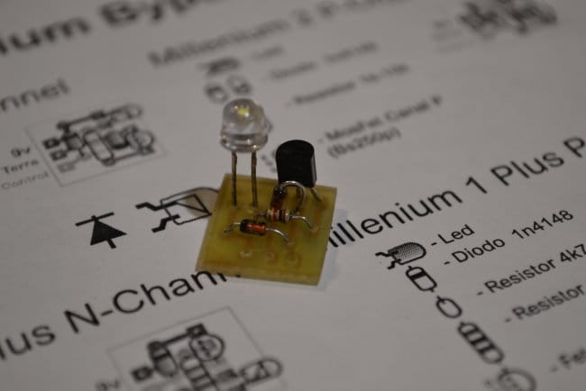 Кроме транзистора редких деталей она не имеет, пару диодов, резистор, ну и сам светодиод. Подключение платы производится по схеме ниже.