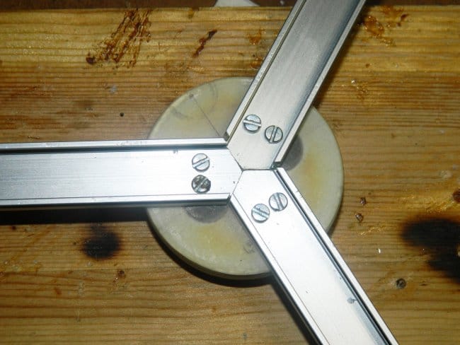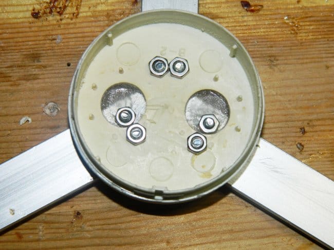 По нему я разметил отрезки светодиодного профиля и с помощью бормашины с отрезным диском запилил их под 120°. Потом закрепил их на крышке с помощью винтиков М2,5 мм и гаек.