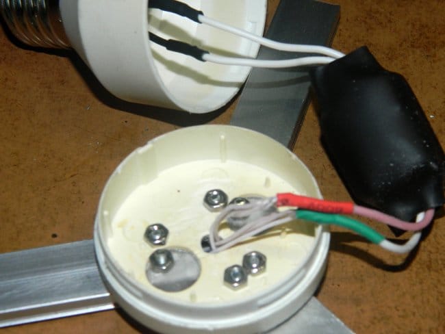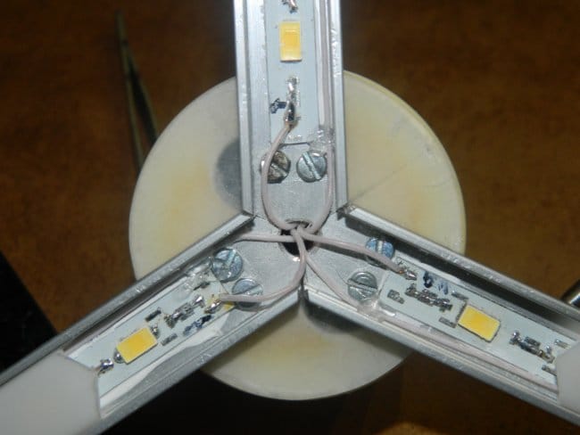 Монтаж вёл проводом МГТФ сечением 0,17 мм². Подпаял провода к линейкам, просверлил отверстие в центре крышки и вывел провода через него внутрь. Затем, соблюдая полярность, подпаял их к выходу драйвера, а входные провода драйвера подпаял к цоколю лампы. Все соединения изолировал с помощью термоусадочной трубки. Драйвер тоже поместил в термоусадку.