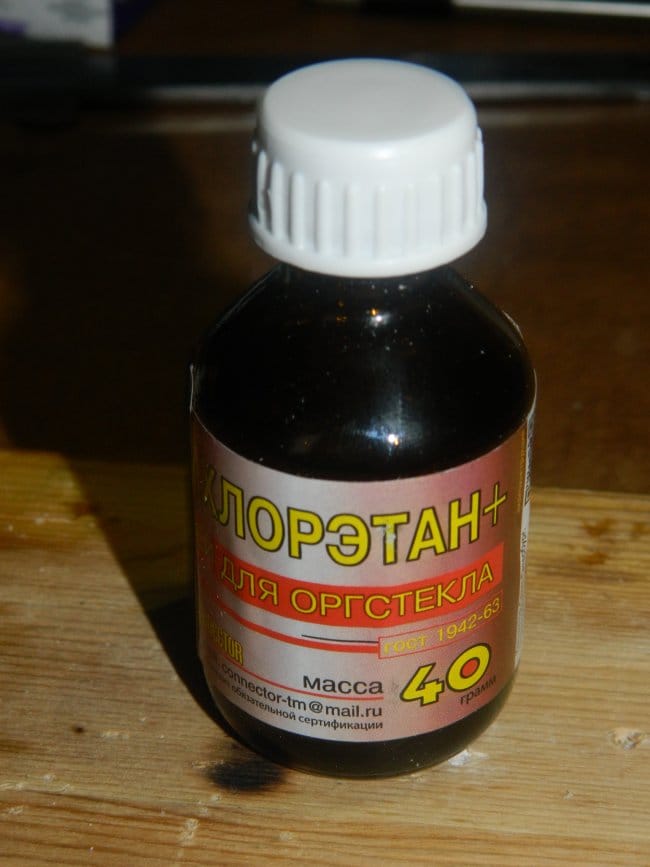 У меня был дихлорэтан, но, к сожалению, он был не подготовлен к склейке. Пришлось добавить в него стружку оргстекла и ждать, пока она раствориться.
