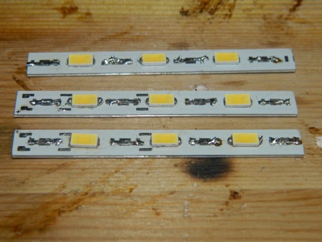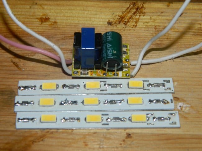 Для светодиодов я использовал алюминиевые линейные платы на 30 светодиодов, соединённых последовательно, купленные на распродаже по 5 руб. за штуку (покупал, когда делал подсветку книжного шкафа в кабинете). Разрезал плату по три светодиода с пропуском через один для лучшего охлаждения. Таким образом, я использовал всего одну плату.