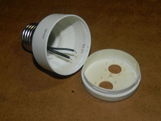 Как и всегда я использовал только корпус от энергосберегайки – он разбирается очень просто (соединён на защёлках). Единственное, что я сделал, это срезал приливы на крышке — мне нужна ровная поверхность.
