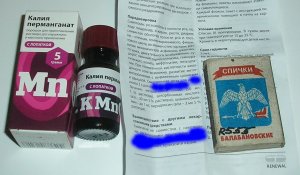 Далее необходимо подготовить марганцовку. Если сразу бросить её в раствор гидроперита, реакция начнётся бурно. А т.к. реакция сильно экзотермическая, марганцовка может вылететь из бутылки и попасть в глаза, например. Поэтому реакцию на начальном этапе следует замедлить.