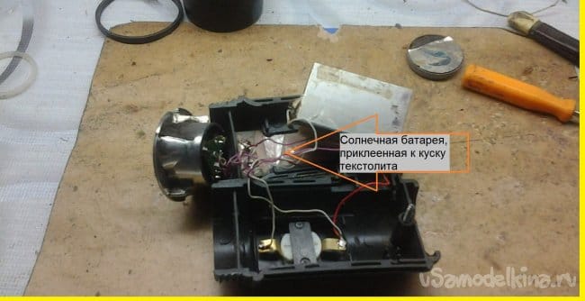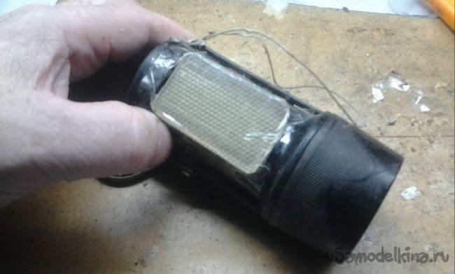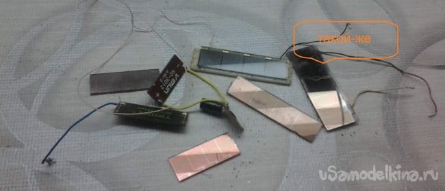 Работает, но началось окисление контактов выключателя, приходится щелкать несколько раз. Собран в корпусе от аккумуляторного фонарика, у которого была боковая светодиодная панель. Вместо этой панели почти точно встала солнечная батарея (СБ) от калькулятора, такого типа.