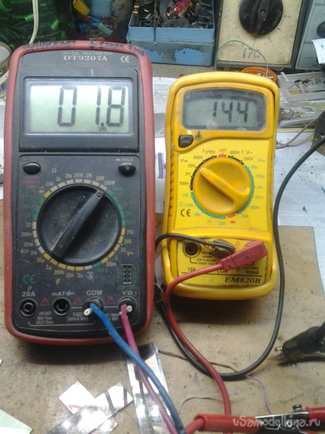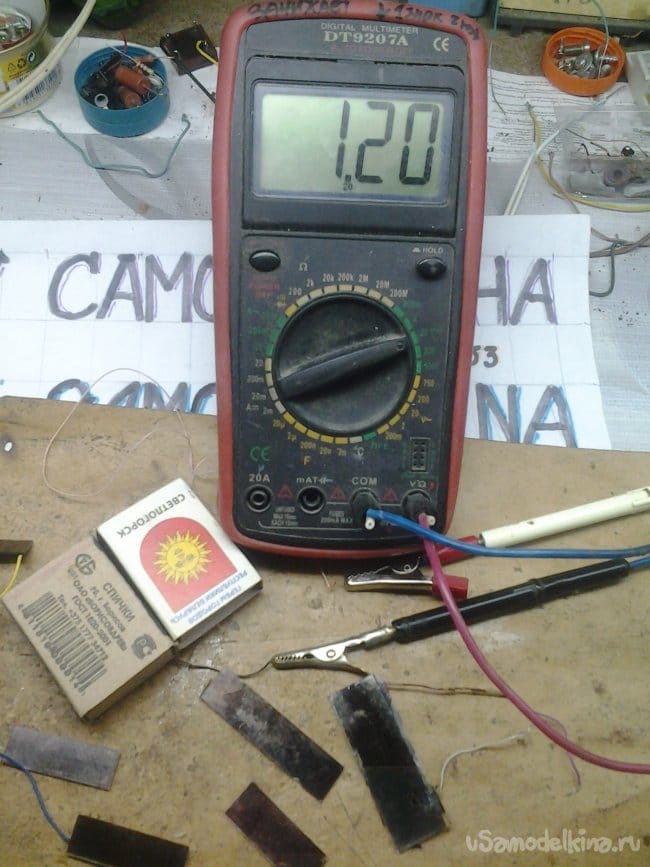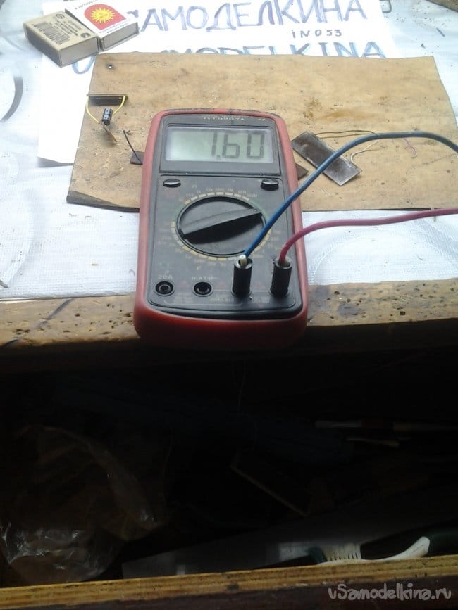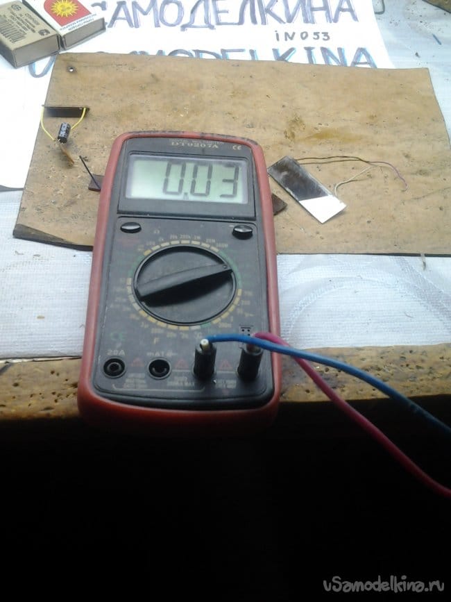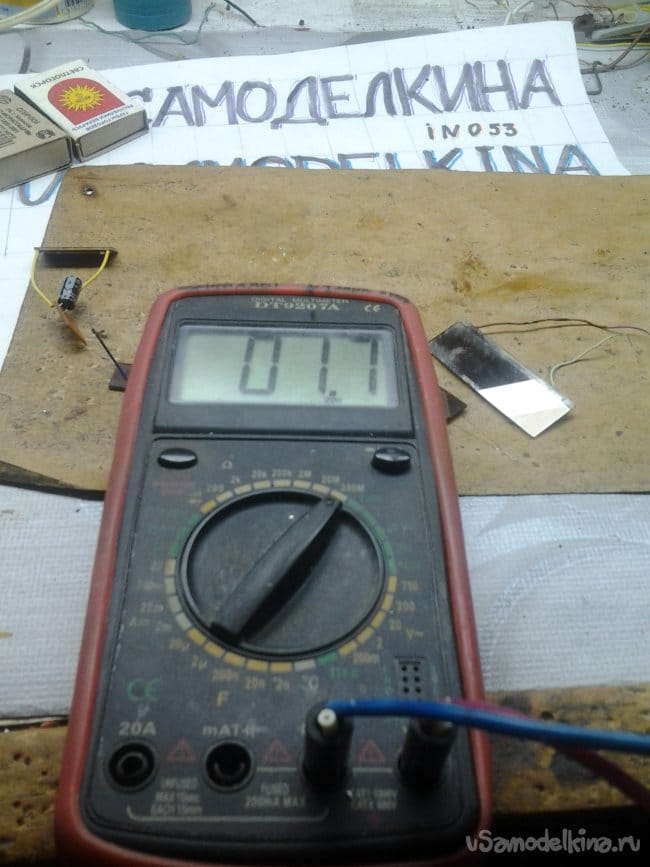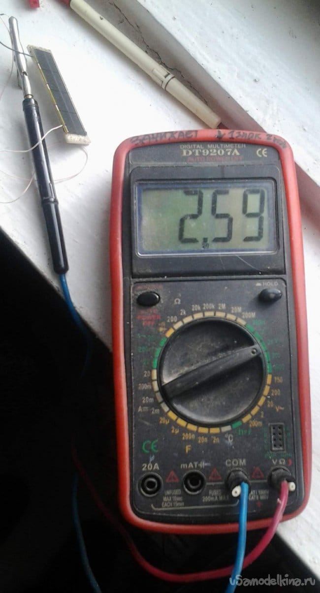Берем 4-х секционную СБ, половинку от примененной в фонарике. ЭДС на х.х. при полном освещении рабочего стола на табло мультиметра – 2,2 В.