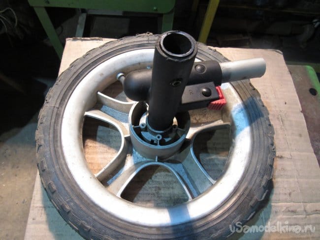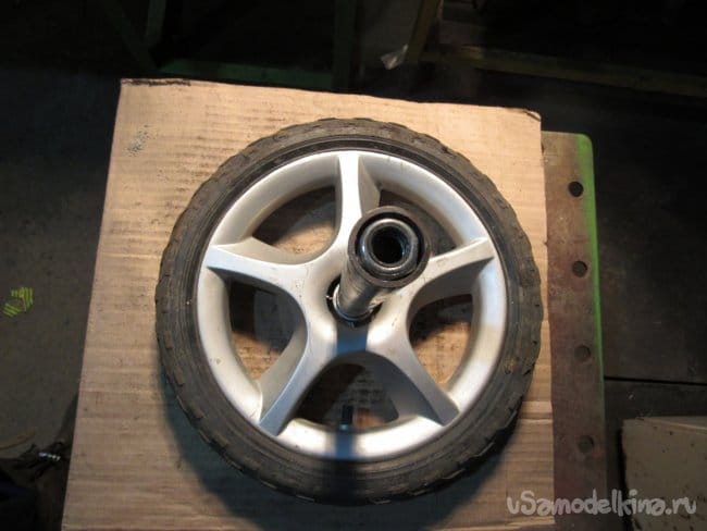 Кто-то из соседей выбросил на помойку повреждённую детскую коляску. Я не мог пройти мимо такого богатства, т.к. колёса были в исправном состоянии. Пытался снять колёса с оси, но мне это не удалось. Конструкция оказалась не разборной. Пришлось отрезать по частям.