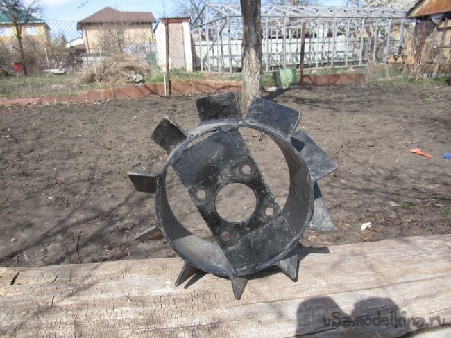 На выступающую часть новой оси с внутренней стороны колеса надел доработанную каретку от заводского колеса мотоблока. Доработка заключается в том, что обрезал квадратную пластину (см. фото)