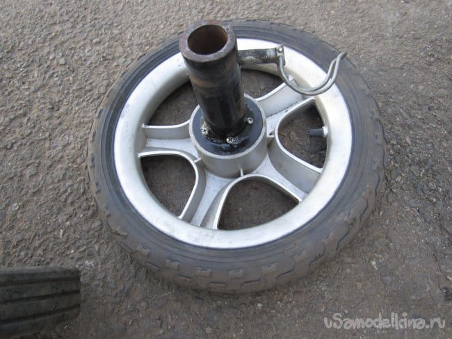 Трубу оси колеса прихватил сваркой к трубе доработанной каретки изнутри трубы. Лучше и удобнее было бы приваривать через технологическое отверстие, просверленное в трубе каретки. Для надёжности залил в пустоты колеса эпоксидную смолу, затем быстро затянул болт, замазал герметиком шайбу и перевернул вниз колесо для того, чтобы эпоксидка не вытекла до полимеризации.Получились вот такие ведущие колёса на мотоблок. Устанавливаются они на мотоблок легко и фиксируются при помощи заводских фиксаторов.