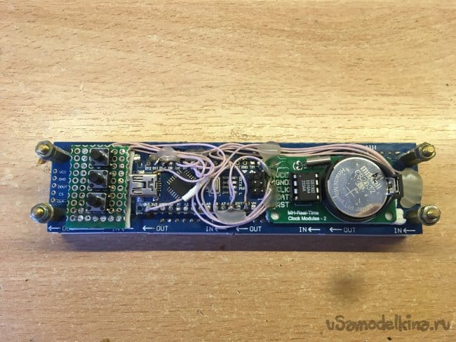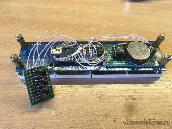 После успешной прошивки переходим к сборке часов. Прикручиваем стойки к матрице по краям для крепления в корпус. Крепим Arduino, модуль часов и кнопки на двухсторонний скотч к обратной стороне платы матрицы. Кстати о кнопках, их припаиваем к кусочку макетной платы, припаиваем резисторы с обратной стороны и соединяем по схеме. Конечно, кнопки можно "вынести" на длинных проводах, но для моего корпуса удобнее так. Соединяем всё проводами. Схема: