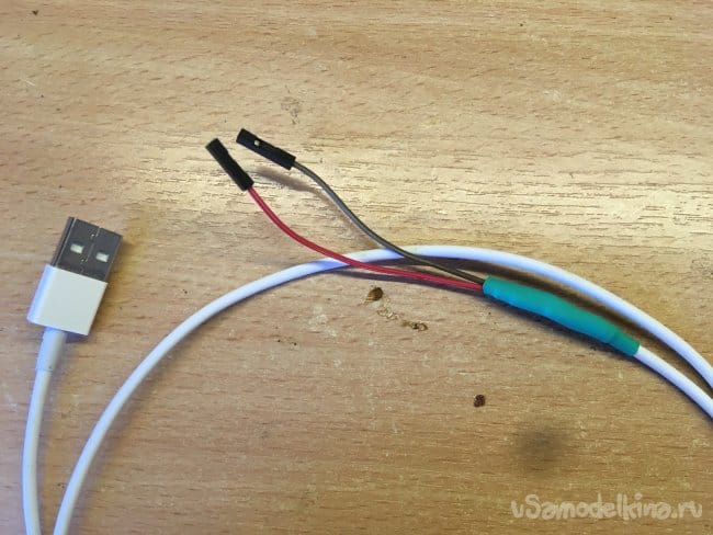 Берём ненужный USB-провод от зарядки и откусываем разъём микро-USB (в моём случае). Теперь зачищаем провода и аккуратно припаиваем разъёмы "мама". Места спайки изолируем термоусадкой. Соблюдая полярность питания подключаем провод к разъёму ISP для программатора.