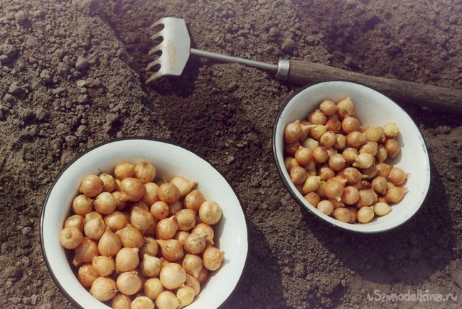 После внесения удобрений и весенней перекопки почвы для посадки севка сделайте невысокую гряду шириной около 1 м. Расстояние между рядами для севка 20-25 см, в ряду 10-15 см. Глубина посадки зависит от почвы и размера севка, но самое главное, чтобы вся луковичка находилась во влажном слое почвы.