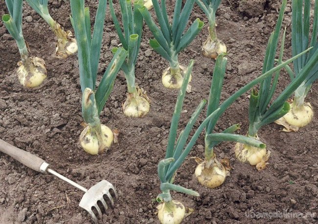Есть такой прием, как "валяние" лука. Раньше считали, что он ускоряет созревание лука. Однако, этот прием искусственный. Опытные огородники никогда не пригибают перо - шейка лука очень хрупкое место. Сломанное перо может подгнивать, а от него и вся луковица. Чтобы ускорить созревание лука, достаточно прекратить полив за две недели до уборки, а во влажные дни можно также отгрести землю от луковиц.
