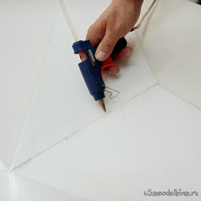 В наличии термопистолет на 12 вольт, для понижения температуры плавления клея, запитал его десятью вольтами. Побоялся расплавить потолочку.